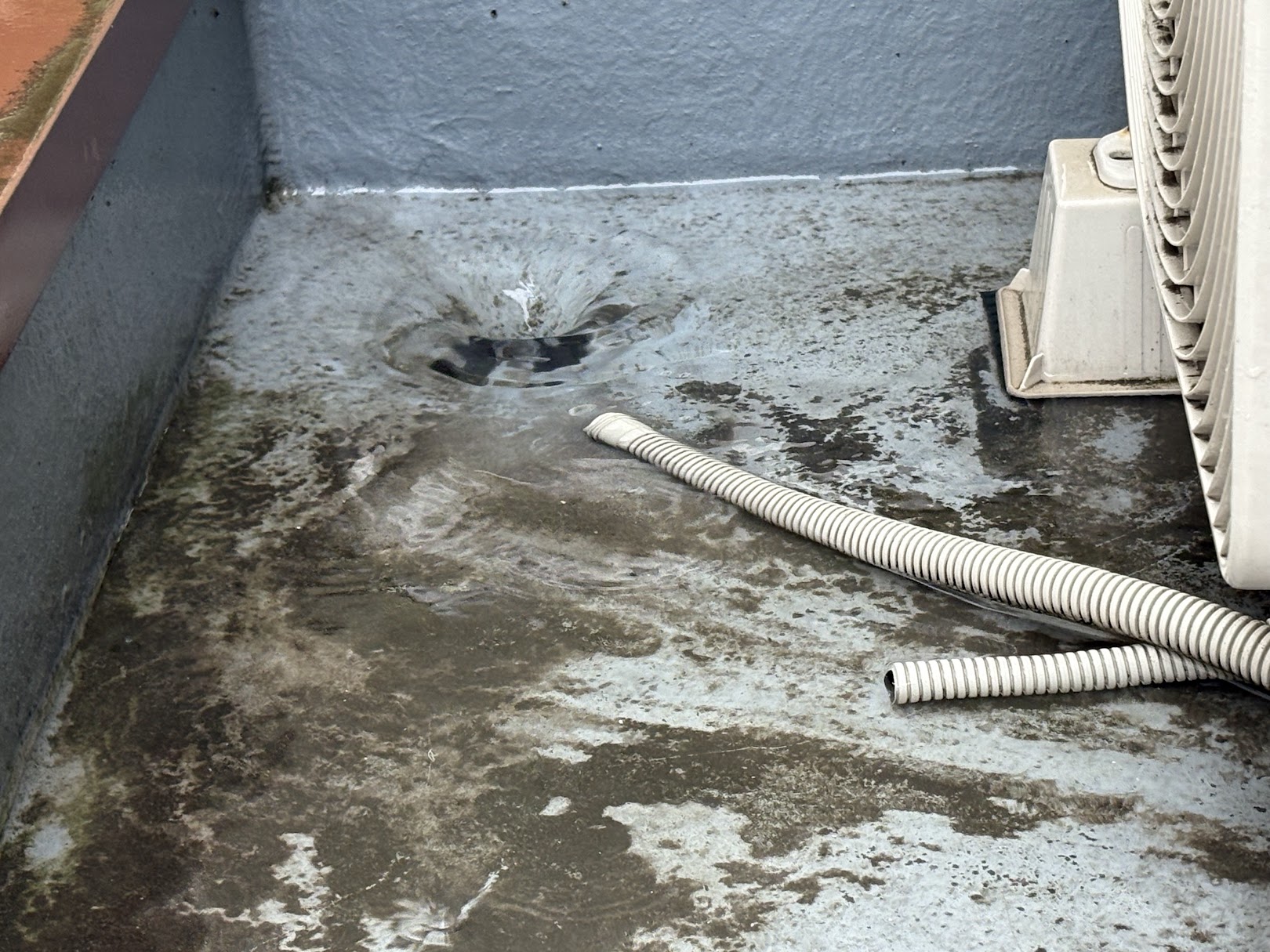 今回の雨漏れの原因はベランダ排水口の詰まり(泥・黄砂)
